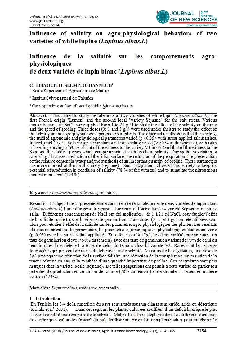Abstract – This aimed to study the tolerance of two varieties of white lupin (Lupinus albus. L,) the first French origin "Lumen" and the second local "variety Séjnane" for the salt stress. Various concentrations, of NaCl, were applied from 1 to 21 g / l to study the effect of the salinity on the rate and the speed of seeding. Three doses (0; 1 and 3 g/l) were used under shelters to study the effect of the salinity on the agro-physiological parameters of plants. The obtained results show that the seeding, the studied agronomic and physiological parameters varied (p <0,05> with stress applied salt marshes. Indeed, until 17g / l, both varieties maintain a rate of seeding raised (> 50 % of the witness), with rates of seeding varying of 90 % of that of the witness to the variety V1 in 65 % of that of the witness to the Rare are the fodder species which can germinate at such levels of salinity. During the vegetation, a rate of 3g / l causes a reduction of the foliar surface, the reduction of the perspiration, the preservation of the relative content in water and the synthesis of an important quantity of proline. These parameters are more marked at the local variety (sejnane). Such adaptations allowed this variety to keep its potential of production in condition of salinity (78 % of the witness) and to stimulate the nitrogenous content in material (124 %).